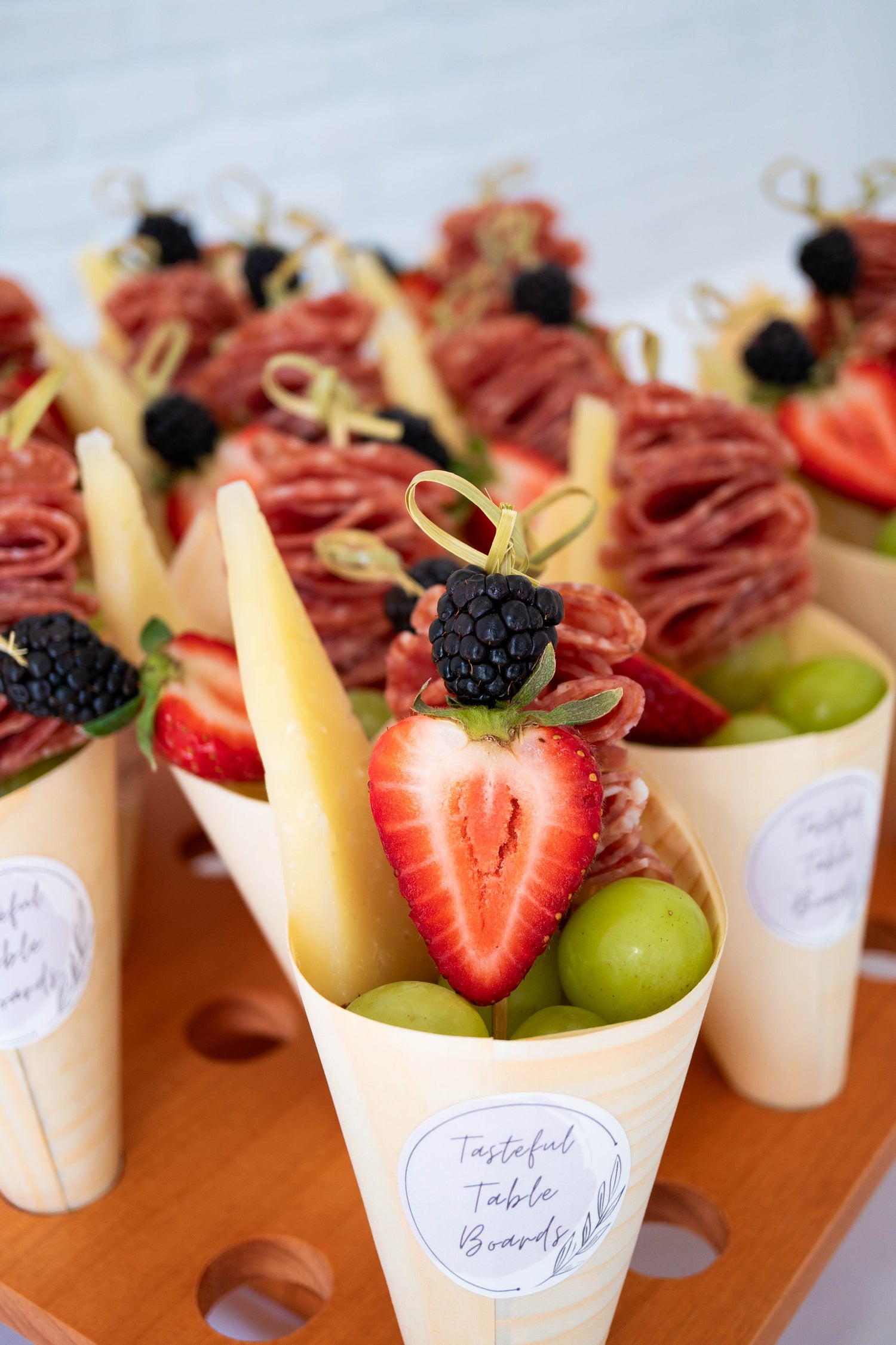 Our signature charcuterie cones are a sweet and savory handheld treat, perfect for casual and celebratory gatherings. Each cone features a skewer of folded salami, a wedge of aged Manchego cheese, juicy grapes, and fresh seasonal berries — all beautifully arranged for easy, mess-free enjoyment.